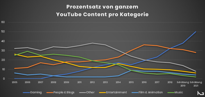 Wenn man dieser Statistik aber einmal die Verteilung der Uploads gegenüberstellt, könnte es in den kommenden Jahren zu einem Paradigmenwechsel in der YouTube-Nutzung kommen. Der Anteil von Gaming-Inhalten hat den Content von Bloggern bzw. Influencern nämlich bereits eingeholt und wird Prognosen zufolge in naher Zukunft weiter überproportional stark ansteigen.