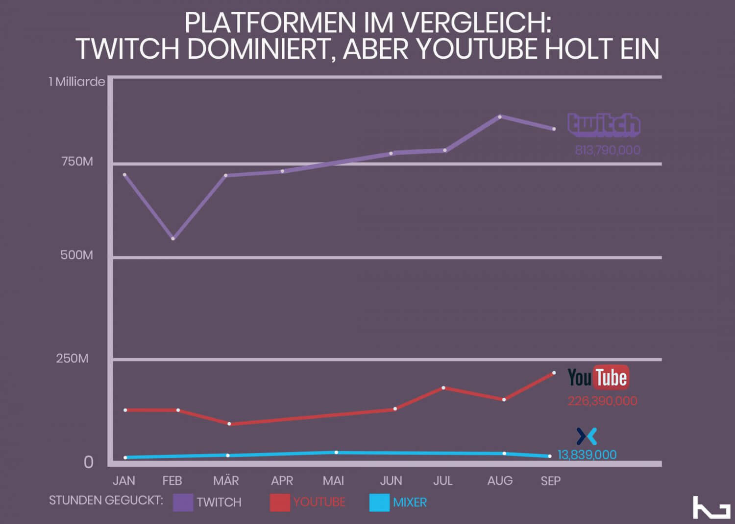 Ein Fakt, den viele Beobachter ohne Insiderwissen gemeinhin ausblenden. Eine Konsequenz dessen, dass Twitch im Vergleich zu YouTube noch nicht flächendeckend als bedeutsame Ausspielplattform wahrgenommen wird. Das jedoch ist ein gewaltiger Trugschluss. Im dritten Quartal 2018 wurden dort 2,5 Milliarden (!) Stunden Videomaterial gestreamt, allein mehr als 800 Millionen Stunden im September. Das war mehr als das Dreifache als bei YouTube im selben Zeitraum. Dieser Unterschied wird umso bedeutsamer, wenn man bedenkt, dass Twitch täglich auf 15 Millionen aktive Nutzer weltweit kommt – ein winziger Bruchteil im Vergleich zu der Masse bei YouTube.