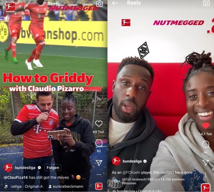 Für die digitalen Kanäle der Fußball Bundesliga (>12 Millionen Follower) produzieren wir wöchentlich die Show „Nutmegged“, welche vorwiegend über Instagram Reels und YT Shorts ausgespielt wird. Das Augenmerk liegt auf der Interaktion mit Spielern, deren Lifestyle und der Ausrichtung auf die internationale GenZ-Zielgruppe. Bildlich arbeiten wir mit vielen wiedererkennbaren Elementen, um trotz "Short-Term-Attention-Rate" als Dauerformat aufzufallen. Dazu gehört neben der Dauereinblendung des Shownamens auch der Fokus auf die Moderatorin. Die Aufrufzahlen von "Nutmegged" können mit dem klassischen Fußball-Content locker mithalten.